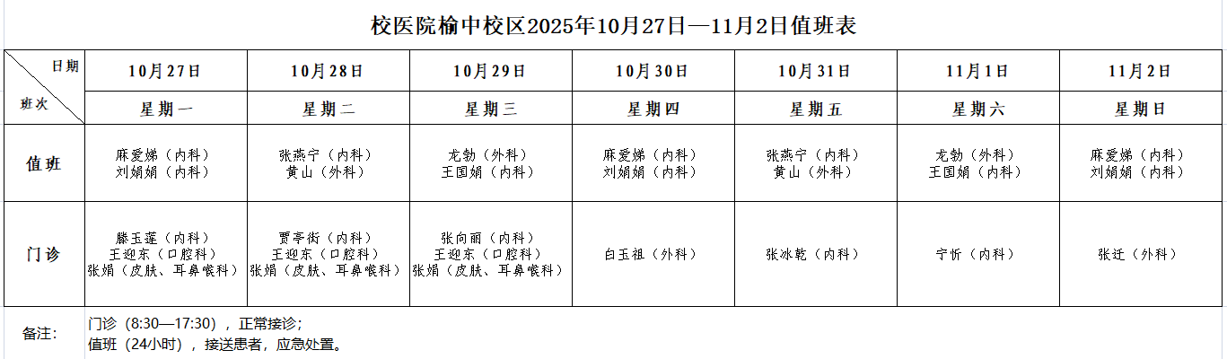 校医院榆中校区2025年10月27日—11月2日值班表