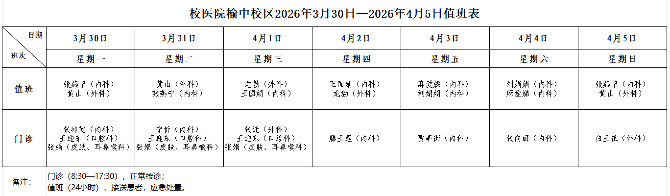 校医院榆中校区2026年3月30日—2026年4月5日值班表