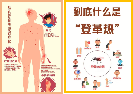 登革热、基孔肯雅热均为蚊媒传染病,由埃及伊蚊、白纹伊蚊叮咬感染者后,携带病毒再叮咬他人导致传播。当前我国一些地区仍存在基孔肯雅热、登革热等蚊媒传染病的传播。登革热主要症状包括发热、疲乏、厌食、恶心以及“三痛”(剧烈头痛、后眼窝痛、肌肉和关节痛)和“三红”(面部、颈部、胸部潮红)。基孔肯雅热以发热、皮疹和关节疼痛为主。